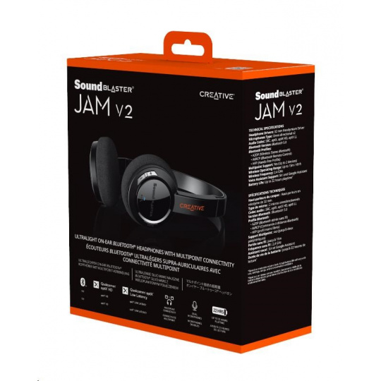 Vaše obľúbené prenosné Bluetooth® slúchadlá na uši sú späť – so starým dizajnom ľahkým ako pierko a vysoko kvalitnými neodymovými meničmi! Produkt Sound Blaster JAM V2 je teraz vybavený technológiou Bluetooth 5.0. Spolu s rozšírenými zvukovými kodekmi aptX™ HD a aptX™ Low Latency poskytuje najlepší bezdrôtový posuch. Užite si bohatý a ohromujúci zvuk. Funkcia Multipoint umožňuje jasne prepínať medzi dvoma rôznymi zdrojovými zariadeniami Bluetooth, bez toho aby ste stratili rytmus.