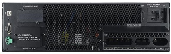 | Obsah dodávky | UPS + batériový modul; kryt Vstup/Výstup Termínal bloku ; používateľská príručka; telefónny kábel; PowerPanel®Business Edition softvérové CD; USB kábel typ A+B; lišty pre uchytenie v racku; konzola pre montáž do racku (2+2); spojovací plech (2); lyžiny (2+2); sériový kábel; napájací kábel; montážna súprava |