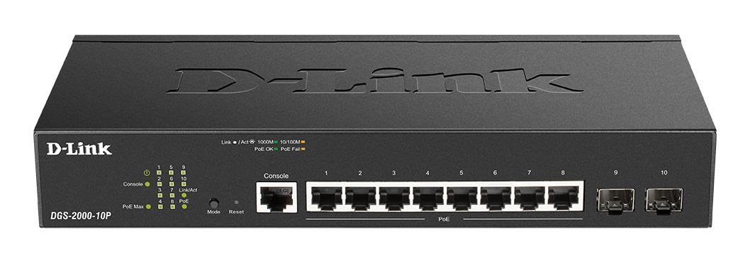 D-Link DGS-2000-10P je plne riadený 10-portový gigabitový riadený prepínač PoE pre kancelárske a podnikové siete. Prepínač je vybavený 8 portami RJ-45 10/100/1000M s rozhraním 802.3at PoE+ (max. 30 W na port) a dva dvojrýchlostné 100/1000M SFP porty na optické prepojenie. Celkový výkon PoE prepínača je 65 W. Konštrukcia bez ventilátora zaisťuje tichú prevádzku a umožňuje nasadenie priamo v kancelárii, súčasťou dodávky sú aj držiaky na montáž do 19" rackov. Prepínače D-Link radu DGS-2000 ponúkajú komplexnú sadu funkcií L2, bezpečnostných funkcií, funkcií kvality služieb (QoS) a základných funkcií L3 (max. 4 IP rozhrania, statické smerovanie s max. 128 záznamov IPv4/IPv6, predvolená trasa, IPv6 Neighbor Discovery). Riešenie prípadných problémov so sieťou uľahčuje štandard 802.3ah OAM, diagnostika káblov a jednosmerná detekcia prepojenia D-Link (DULD). Poskytovatelia internetových služieb ocenia funkcie Q-in-Q (Port Based), Multicast VLAN (ISM VLAN) alebo IGMP Authentication/Filtering na efektívnu prevádzku služieb IPTV. Prepínač sa spravuje prostredníctvom webového rozhrania, sériovej konzoly CLI, príkazov Telnet, SLL, SSH alebo SNMP. Na počiatočnú konfiguráciu a základnú správu je k dispozícii bezplatný softvérový nástroj D-Link Network Assistant (DNA) a mobilná aplikácia, zatiaľ čo na centrálnu správu väčších sietí je k dispozícii pokročilá platforma D-View 7...