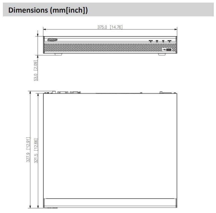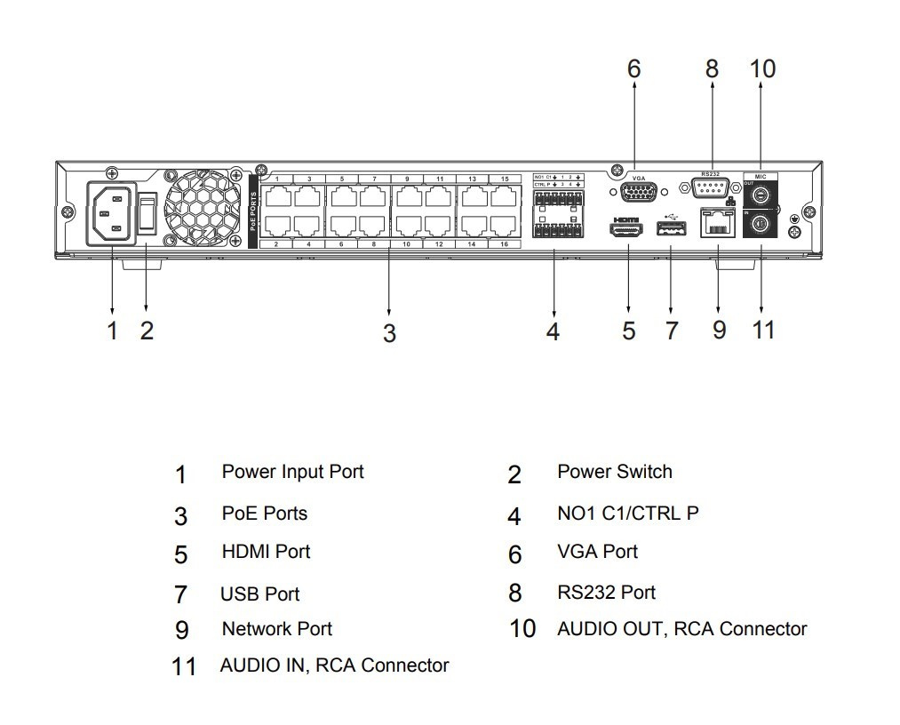 1× 10/100/1000 MbE RJ-45, 16× 10/100 Mb/s RJ-45 PoE (IEEE 802.3 af/at), 1× audio vstup (RCA), 1× zvukový výstup (RCA), 4× alarmový vstup, 2× budíkový výstup, 2× USB 2.0, 2× SATA HDD pozícia (max. 20 TB/disk), 1× HDMI, 1× VGA, 1× RS-232.