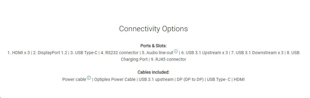 | Napájací kábel | Napájací kábel Optiplex | USB 3.1 upstream | DP (DP na DP) | USB Type-C | HDMI |
