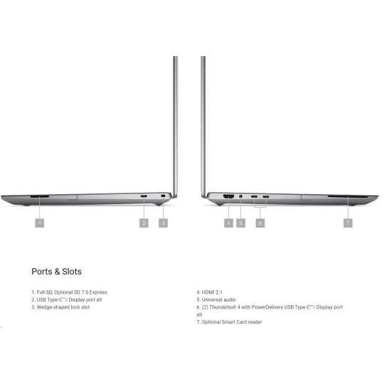 | Full-SD, voliteľné SD 7.0 Express USB Type-C™/ Display port alt Zámok typu wedge slot HDMI 2.1 Univerzálny audio výstup (2) Thunderbolt 4 s PowerDelivery USB Type-C™/ Display port alt Voliteľný čítač kariet |