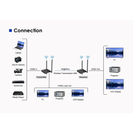 - Podporuje bezdrôtový prenos rozlíšenia 4K@60Hz a Full HD 1080p na vzdialenosť až 50m