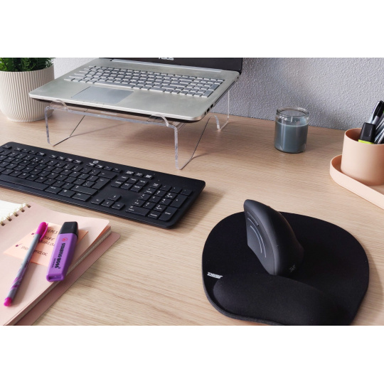 Ergonomická podložka pod myš s opierkou zápästia udržiava zápästie v správnej polohe počas práce s myšou.  ? Prostorný dizajn – minimalizuje napätie v ruke a uľahčuje plynulejší pohyb myši ? Protisklzová spodná strana – zabezpečuje stabilné umiestnenie podložky na stole ? Ergonomická opierka zápästia – poskytuje stály oporu a znižuje nepohodlie pri dlhodobom používaní  Podpera zápästia s pamäťovou penou sa prirodzene prispôsobí vášmu zápästiu, čím zabezpečuje maximálne pohodlie. Zvýšená opierka podporuje zdravé ergonomické vyrovnanie a znižuje zaťaženie zápästia pri dlhodobom používaní myši.