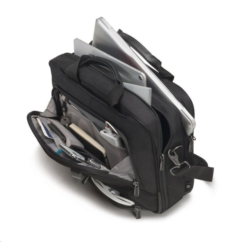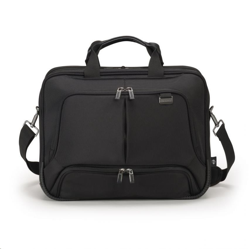 Cestujte "1. triedou" so zariadením Eco Top Traveller PRO. Taška toploader vás spoľahlivo sprevádza všade a spĺňa najvyššie štandardy kvality, funkčnosti a ochrany: vďaka pozornosti venovanej detailom je táto taška DICOTA jedným z vašich najspoľahlivejších obchodných partnerov! Oddeľovacia stena systému fitall v priehradke na notebook je chránená cez notebook a automaticky sa prispôsobí veľkosti od 15 do 17.3". Perforovaný, a teda ľahký penový materiál EVA v uzamykateľnom priestore na notebook dokonale chráni okraje vášho zariadenia. Povrchová úprava s protišmykovou technológiou zaisťuje dokonalé uchopenie notebooku v priehradke. Vynikajúca ochrana pre váš tablet do 12.9" vďaka priehradke v tvare EVA s mimoriadne mäkkou vnútornou podšívkou Nylex. Veľkorysý úložný priestor na dokumenty. Predné vrecko s príveskom na kľúče a vkladacími vreckami umožňuje organizovať osobné vybavenie a poskytuje priestor na ďalšie mobilné príslušenstvo. Ďalšie vrecko na nabíjačku a káble. Taška je ľahká a pohodlná do ruky vďaka kvalitným rukovätiam z pravej kože. Popruh na vozík možno použiť aj ako ďalšiu priehradku na dokumenty. Dno tašky je vyrobené z nepremokavého materiálu. Puzdro Eco Top Traveller PRO je preto pre vás ideálne, ak ste stále na cestách a chcete podporiť recykláciu PET fliaš ekologickým puzdrom.