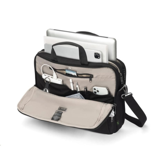 Taška Top Traveller FIVE je navrhnutá tak, aby chránila vaše zariadenie a zároveň vám umožnila jednoduchý prístup k nevyhnutnostiam. Uzamykateľná priehradka na notebook s ochranou DCT Notebook Protection a polstrovaním rohov z HDF peny a EVA zabezpečuje maximálnu bezpečnosť, zatiaľ čo integrovaná kapsa poskytuje bezpečné uloženie tabletov do veľkosti 12,9". Hlavná priehradka ponúka dostatok priestoru pre dokumenty, priečinky alebo mobilné vybavenie a predná časť obsahuje usporiadané kapsy na príslušenstvo. Malá predná kapsa poskytuje ďalší úložný priestor pre káble a menšie predmety. Vyrobené z 23,5" recyklovaných PET fliaš.