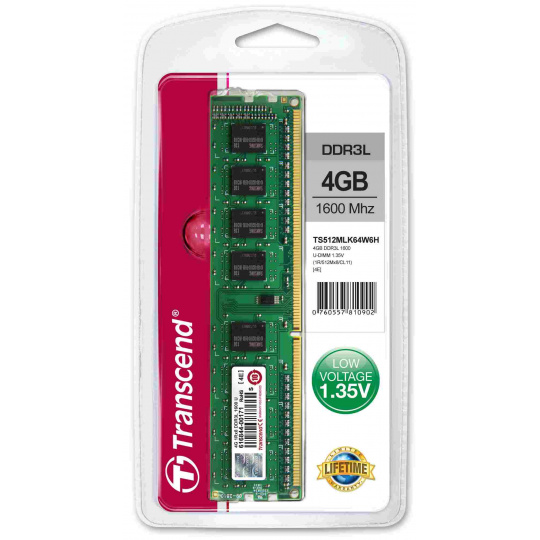 Pamäťové moduly Transcend sú vyrobené podľa prísnych špecifikácií z najlepších dostupných čipov a materiálov a prechádzajú náročným laboratórnym testovaním, aby sa zabezpečil najlepší možný výkon. Nízkonapäťové moduly DIMM Transcend DDR3 pracujú pri nominálnom napätí len 1.35 V, čo nielenže produkuje menej tepla, ale tiež znižuje elektrické zaťaženie pamäťového radiča a ponúka až 15 % úsporu energie v porovnaní so štandardným 1.5V.