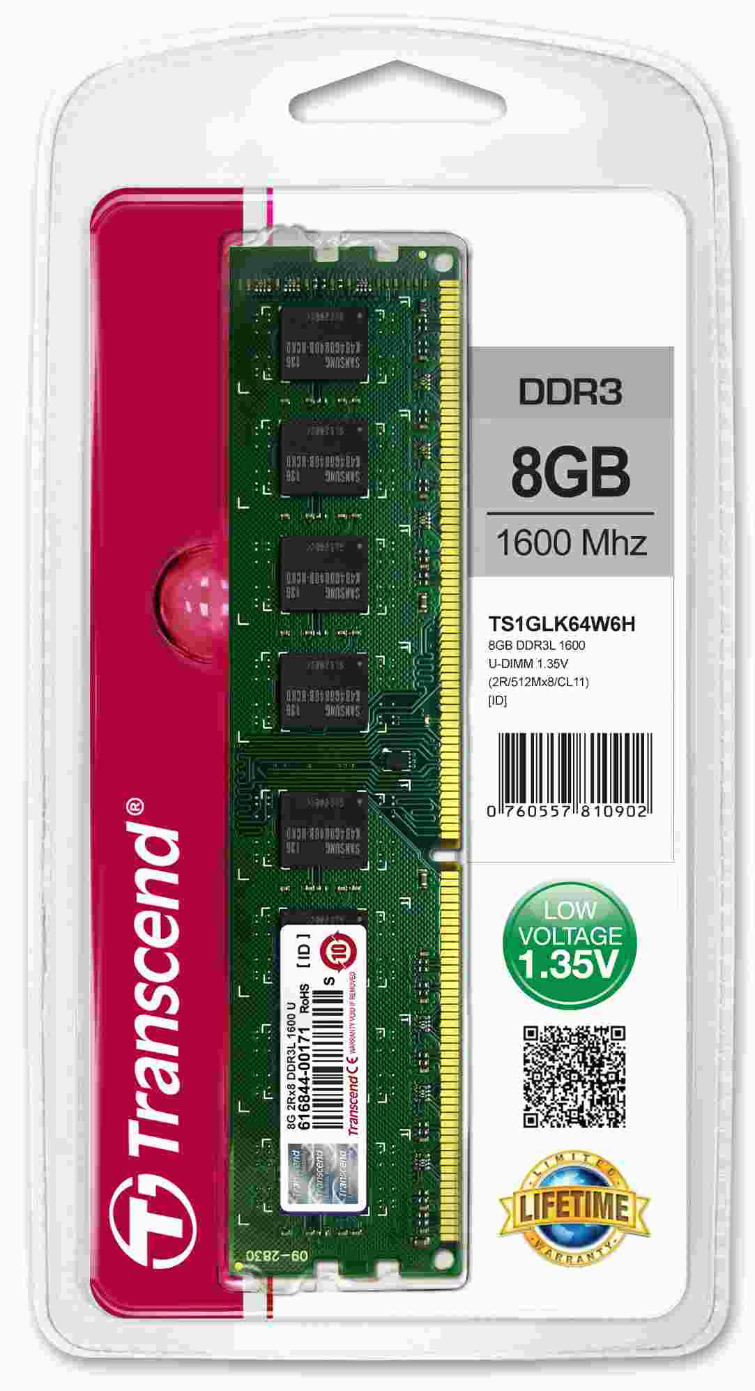 Pamäťové moduly Transcend sú vyrobené podľa prísnych špecifikácií z najlepších dostupných čipov a materiálov a prechádzajú náročným laboratórnym testovaním, aby sa zabezpečil najlepší možný výkon. Nízkonapäťové moduly DIMM Transcend DDR3 pracujú pri nominálnom napätí len 1.35 V, čo nielenže produkuje menej tepla, ale tiež znižuje elektrické zaťaženie pamäťového radiča a ponúka až 15 % úsporu energie v porovnaní so štandardným 1.5V.