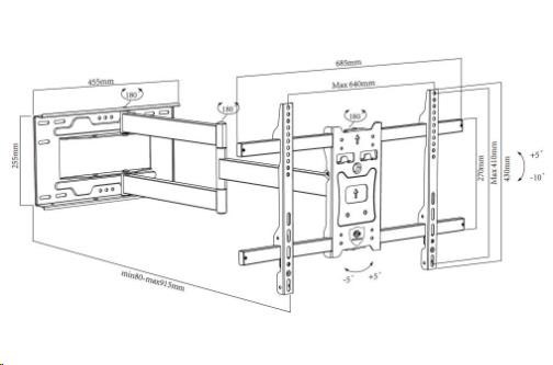 Dlhý otočný držiak na televíziu Ergosolid ONYX-20 Vynikajúci držiak s dĺžkou 80-915mm a možnosťou otočiť TV 70" kolmo na stenu na obe strany Kvalitný nástenný držiak na zavesenie televízorov s uhlopriečkou 43" až 75", televízory s uhlopriečkou do 70" je možné na držiaku otáčať kolmo na stenu na obe strany. Konštrukcia držiaku je oceľová a zabezpečí bezpečné a spoľahlivé zavésenie televízorov, ktoré majú hmotnosť až 45kg. Televíziu je možné nielen otáčať do strán, ale aj naklápať nahor alebo nadol a meniť vzdialenosť od steny. V prípade nepresnej inštalácie alebo nerovností držiak umožňuje korekciu až +/- 5°. Podporuje VESA štandardy 200x100 až 600x400. Farebné prevedenie čierne, záruka 3 roky. Extra dlhý držiak na TV na otáčanie TV až 70" kolmo na stenu - ergosolid onyx20 Technické údaje: nosnosť 45kg VESA štandardy 200x100 až 600x400 na televízie 43" až 75" otáčanie TV do strán +/- 90° TV s uhlopriečkou do 70" je možné otočiť aj kolmo na stenu na obe strany vzdialenosť TV od steny 80-915mm sklon +5° / -10° korekcia roviny +/- 5° kvalitná oceľová konštrukcia bezpečný a spoľahlivý držiak balenie obsahuje sadu inštalačného materiálu farba čierna záruka 3 roky