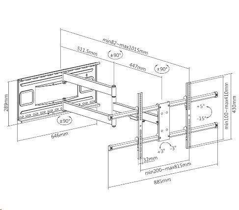 Otáčanie TV 43-80" i kolmo ku stene na obe strany, dĺžka 82-1015mm, naklápanie, VESA 200x100 až 800x400, nosnosť 50kg Extra dlhý držiak pre otáčanie kolmo ku stene aj veľkých televízorov s uhlopriečkou až 80". Vďaka nastaviteľnej vzdialenosti od steny od 82mm až do 1015mm umožňuje držiak Ergosolid Largo otočenie o 90° na obe strany televízií s uhlopriečkami 43" až 80". Vďaka nosnosti 50kg a veľmi pevnej konštrukcii je polohovanie veľmi bezpečné a spoľahlivé. Televíziu je možné nakláňať +5° až -15° a korigovať rovinu obrazovky o +/-3°. Vďaka nástennému úchytu s rozmermi 646mm a 289mm sa celková hmotnosť držiaku s televízorom veľmi dobre rozloží na veľkú plochu, inštalácia je veľmi bezpečná. Na držiaku je bezpečnostné skrutky na zabezpečenie TV na držiaku a zamedzenie nechcenej vysadene alebo pádu TV. Farebné prevedenie čierne, materiál oceľ. Záruka 5 rokov. Technické údaje: nosnosť 50kg podporuje VESA štandardy 200x100 až 800x400 zavesenie a otáčanie kolmo ku stene TV 43" až 80" nastaviteľná vzdialenosť od steny 82mm až 1015mm možnosť naklápania televízie +5° až -15° korekcia roviny obrazovky +/- 3° inštalačný materiál súčasťou balenia (viď nižšie) veľmi pevná a bezpečná konštrukcia zabezpečenie TV na držiaku proti vysadeniu materiál oceľ hmotnosť držiaku 13,5kg veľká inštalačná plocha pre rozloženie hmotnosti na stene 646 x 289mm farebné prevedenie čierne záruka 5 rokov