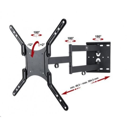 Polohovateľný držiak TV 23-55", dĺžka až 60cm, otočný, sklopný, nosnosť 45kg Nástenný držiak vynikajúcej kvality, na LCD, LED, 3D, Smart televízie 23" až 55". Vynikajúci pomer nastavenia vzdialenosti od steny: 48mm až 595mm. Robustná odolná konštrukcia držiaka zvládne zavedenie televízorov s hmotnosťou až 45kg. Televízor je po zavedení na držiak možné otáčať oboma smermi, naklápať, odsúvať a prispôsobovať k stene, korigovať rovinu TV. Na ramenách sú úchyty na káble. Nástenný úchyt umožňuje mnoho spôsobov montáže na stenu. Držiak je dodávaný v čiernom prevedení, v balení nájdete montážny materiál a prehľadný návod v CZ. Záruka 3 roky. Držiak ErgoSolid Telfor - skvelá kvalita a vynikajúci pomer nastavenia vzdialenosti od steny 48mm až 595mm, nosnosť 45kg Technické údaje: nosnosť 45kg podpora VESA štandardu pre zavedenie TV a monitorov 100x100 až 400x400 odporúčame na televízory a monitory s uhlopriečkou 23" až 55" nastavenie vzdialenosti od steny 48mm až 595mm nastavenie sklonu v rozmedzí +2° až -12° otáčanie na obidve strany až +/- 90° korekcia roviny obrazovky +2° až -2° veľmi pevná, robustná konštrukcia úchyty na káble montážny materiál farebné prevedenie čierne záruka 3 roky Držiak ErgoSolid Telfor podporuje VESA štandardy pre zavedenie TV 23-55": VESA 100x100 VESA 200x100 VESA 200x200 VESA 200x300 VESA 200x400 VESA 300x200 VESA 300x300 VESA 400x200 VESA 400x400 Držiak nepodporuje VESA 75x75 a 400x300