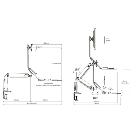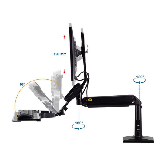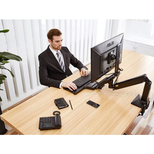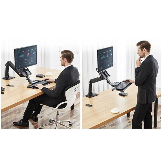 Držiak monitoru a klávesnice NB NB35 Profesionálny stolný držiak na monitor 17-30" s poličkou na klávesnicu 560x200mm, výškovo nastaviteľný +/-480mm, naklápanie +12°/-15°, otáčanie +/-180°, pivot, možnosť vysunutia a zaklopenia police, priehradka, 2x USB 3.0 porty, práca v sede aj v stoji, VESA 75x75 a 100x100, nosnosť 9kg Univerzálny stolný držiak na monitor 17-30" a klávesnicu pre ergonomické kancelárie, ktorý Vám umožní kedykoľvek zmeniť pozíciu pre prácu ako v sede, tak aj v stoji. Zmena polohy je veľmi ľahká a rýchla, bez použitia akýchkoľvek nástrojov alebo zložitých nastavovaní - počas okamihu zmeníte výšku až o 480mm. Na držiak je možné uchytiť všetky typy monitorov s VESA štandardom 75x75 alebo 100x100. Držiak umožňuje ľahké kompletné nastavenie podľa potreby - otáčanie do strán, výškovo nastaviteľnosť, náklon obrazovky, posun a náklon police, vzdialenosť od stolového uchytenia, korekcia roviny. Kvalitný duálny úchyt na zabezpečenie na okraji stolu a perfektná fixácia. Profesionálna kvalita, vynikajúce spracovanie, pekný dizajn a veľmi jednoduché nastavenie. Farebné prevedenie čierne. Profesionálny polohovateľný držiak monitora a klávesnice na prácu v sede aj v stoji NB NB35 Technické údaje: maximálne zaťaženie 9kg minimálne zaťaženie 2kg podporuje VESA štandardy 75x75 a 100x100 možnosť rozšírenia VESA štandardu na 200x100 alebo 200x200 ideálny na monitory a televízory s uhlopriečkou 17-30" otáčanie do strán +/- 180° náklon monitoru -12° / +15° funkcia pivot - možnosť polohy monitora na šírku alebo na výšku maximálna výška 950mm od stolovej dosky maximálna dĺžka od uchytenia 1020mm celkové výškové nastavenie +/- 480mm úprava výšky samotného monitora na držiaku 100mm polica na klávesnicu s rozmermi 560x200mm možnosť vysunutia police +/- 60mm, naklopenie +/- 12°, možnosť úplného zaklopenia uchytenie na okraj stola, duálny úchyt, na dosky o hrúbke 20-90mm 2x USB 3.0 port farebné prevedenie čierne profesionálna kvalita, jednoduchá polohovateľnosť záruka 3 roky Pracovná stanica - polohovateľný držiak na monitor a klávesnicu pre voľbu, či chcete pracovať v sede alebo v stoji NB NB35. Polohovateľný držiak na monitor aj klávesnicu, výškové nastavenie pre možnosť práce v sede alebo v stoji, jednoduché a rýchle polohovanie - Fiber Mounts NB35 Držiak podporuje VESA štandardy: VESA 75x75 VESA 100x100