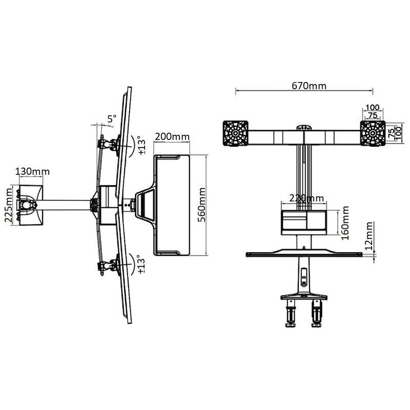 Profesionálna pracovná stanica pre dva monitory 17-27" s policou na klávesnicu a myš, ergonomický držiak pre rýchlu zmenu pre prácu vsed E alebo vstoje, plná polohovateľnosť, VESA 75x75 a 100x100, plynová pružina, nosnosť 15kg