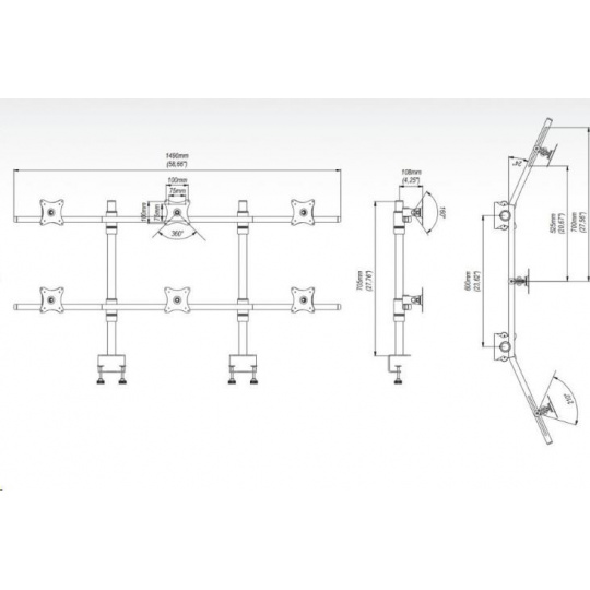 Technické údaje: nosnosť 60kg na monitory s uhlopriečkou 13" až 27" VESA norma 75x75mm a 100x100mm - uchytenie u 99% monitorov nastavenie vzdialenosti monitorov od stredu nastavenie sklonu +/- 80st. funkcia pivot - nastavenie monitoru vodorovne, zvisle alebo pod uhlom uchytenie na stôl vo dvoch bodoch atest kvality a funkčnosti TUV veľmi jednoduchá a rýchla montáž farba strieborná alebo čierna záručná lehota 10 rokov