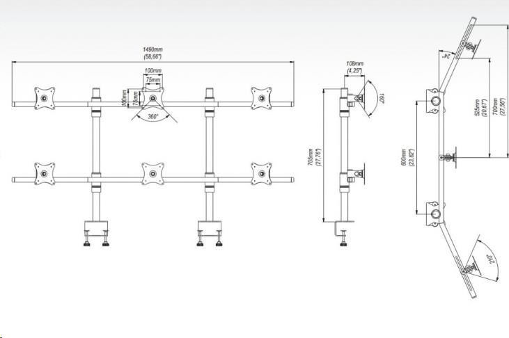 Technické údaje: nosnosť 60kg na monitory s uhlopriečkou 13" až 27" VESA norma 75x75mm a 100x100mm - uchytenie u 99% monitorov nastavenie vzdialenosti monitorov od stredu nastavenie sklonu +/- 80st. funkcia pivot - nastavenie monitoru vodorovne, zvisle alebo pod uhlom uchytenie na stôl vo dvoch bodoch atest kvality a funkčnosti TUV veľmi jednoduchá a rýchla montáž farba strieborná alebo čierna záručná lehota 10 rokov