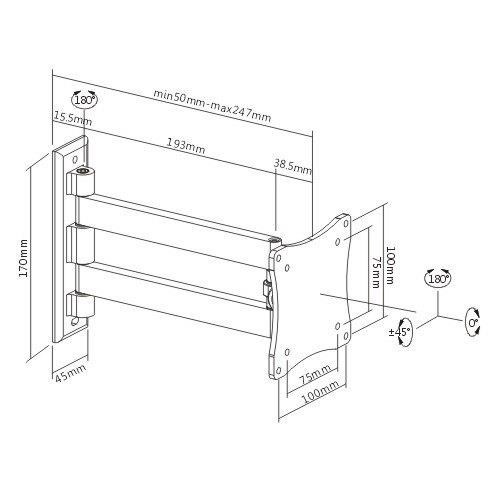 Držiak na LCD LED monitory Fiber Mounts FM102G Otočný, sklopný a výsuvný držiak na monitor 13-30", nastavenie vzdialenosti od steny 50-247mm, VESA 75x75 a 100x100, ľahký, hliníkový, nosnosť 15kg Kvalitný, bezpečný a spoľahlivý nástenný držiak na LCD LED monitory a televízory 13-30", ktorý má hliníkovú, veľmi ľahkú konštrukciu. Držiak umožňuje s televízorom alebo monitorom otáčať, naklápať a meniť vzdialenosti od steny. Inštalácia je veľmi jednoduchá, zvládne ju aj úplný laik. Farebné prevedenie čierne, záruka 5 rokov. Nástenný ľahký hliníkový držiak na LCD LED monitory a televízory Fiber Mounts FM120G je otočný, sklopný a dĺžkovo nastaviteľný Technické údaje: maximálne zaťaženie 15 kg podporuje VESA štandardy 75x75 a 100x100 vhodný na LCD LED monitory 13-30" alebo menšie televízory otáčanie do strán +/- 90° naklápanie +/- 45° minimálna vzdialenosť od steny 50 mm maximálna vzdialenosť od steny 247 mm kvalitná pevná hliníková konštrukcia spoľahlivé a bezpečné zavešenie monitora alebo TV na stenu veľmi jednoduchá inštalácia farebné prevedenie čierne záruka 5 rokov Možnosť priblížiť monitory na vzdialenosť 5cm ku stene a odsunúť až o 24,7cm - držiak Fiber Mounts FM102G. Kvalitný nástenný držiak na LCD LED monitory Fiber Mounts FM102G je odsunuteľný od steny na vzdialenosť až 247mm Držiak monitora a TV Fiber Mounts FM102G podporuje VESA štandardy: VESA 75x75 VESA 100x100 Držiak Fiber Mounts FM102G je vhodný na všetky monitory a televízory, ktoré podporujú VESA 75x75 alebo 100x100 a ich hmotnosť nie je väčšia ako 15kg. Na veľkosti nezáleží. Držiak Fiber Mounts FM102G je vhodný na zavešenie monitorov a televízorov na všetky zvislé povrchy, teda nielen steny a steny, ale aj na piliere, stĺpky, trámy alebo priečky pri stoloch. Veľkou výhodou môže byť naozaj veľmi nízka hmotnosť vďaka hliníkovej konštrukcii, pričom držiak má vynikajúcu pevnosť a uchytenie obrazoviek je úplne bezpečné a spoľahlivé.