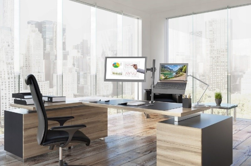 Držiak notebooku alebo laptopu a monitora Fiber Mounts FM23 Kvalitná zostava stolový držiak na monitor 15-27" a držiak na notebook laptop 13-17", polohovateľný, stabilný a pevný Vybavte si kanceláriu skvelým pomocníkom, ktorý vám ušetrí veľa miesta a zlepší ergonómiu pri práci. Zostava Fiber Mounts FM23 obsahuje držiak na monitory 15-27" a držiak na notebooky alebo laptopy s uhlopriečkou 13-17". Držiak monitora podporuje VESA 75x75 a 100x100, je možné ho otáčať do strán, nakláňať, rotovať a výškovo polohovať. Držiak notebooku je možné otáčať do strán a výškovo polohovať. Farebné prevedenie čierne, celková nosnosť 20kg, celokovová konštrukcia. Stolový držiak na monitor a notebook do vašej kancelárie - Fiber Mounts FM23 Technické údaje: nosnosť 20kg na monitory 15-27" na notebooky 13-17" VESA štandard 75x75 a 100x100 otáčanie do strán +/- 135° nakláňanie monitora +/- 90° upevnenie na stolovú dosku s hrúbkou 10-100mm farba čierna záručná doba 3 roky Stolový držiak na monitor a notebook do vašej kancelárie - Fiber Mounts FM23 Držiak na monitory podporuje štandardy VESA: VESA 75x75 VESA 100x100