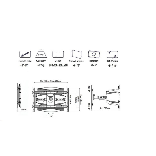Držiak na TV NB P65 Profesionálny držiak na zavešenie TV 43" - 85" na stenu, umožňuje otáčanie do strán až +75° / -75°, naklápanie +5° / -8°, nastavenie vzdialenosti od steny 60 - 500 mm, podporuje VESA štandardy 200x100 až 600x400, korekcia roviny +4° / -4°, systém pre skryté vedenie káblov, nosnosť 68,2 kg Potrebujete zaviesť LCD alebo LED televízor na stenu a otáčať s ním do strán, prípadne nakloniť nahor alebo nadol? Vyžadujete len najvyššiu kvalitu, bezpečnosť a krásny dizajn? V tom prípade Vám odporúčame držiak NB P65: Profesionálny špičkový držiak na televízie NB P65 NB P65 je vhodný na zavešenie všetkých typov televízorov s hmotnosťou do 68 kg a podporou VESA štandardu 200x100 až 600x400, všeobecne na televízory s uhlopriečkou 43" - 85". Po zavešení jednoducho nastavíte televízor do požadovanej polohy - otáčanie do strán, náklon, vzdialenosť od steny, korekcia roviny. Držiak podporuje skryté vedenie káblov. Dodáva sa vrátane všetkého montážneho materiálu a malej vodováhy. Konštrukcia držiaku TV NB P65 je na vynikajúcej úrovni ako kvalitou, tak spracovaním. Vhodný je aj pre každodennú manipuláciu s obrazovkou. Televízny držiak otočný do strán a sklopný NB P65 Technické údaje: maximálne zaťaženie 68,2 kg podporuje VESA štandardy 200x100 až 600x400 odporúčame na TV s uhlopriečkami 43" až 85" otáčanie do strán až +75° / -75° náklon +5° / -8° korekcia roviny +4° / -4° minimálna vzdialenosť TV od steny 60 mm maximálna vzdialenosť TV od steny 500 mm systém pre skryté vedenie káblov kvalitná oceľová konštrukcia montážny materiál súčasťou balenia zaistenie TV proti vysadeniu záruka 5 rokov