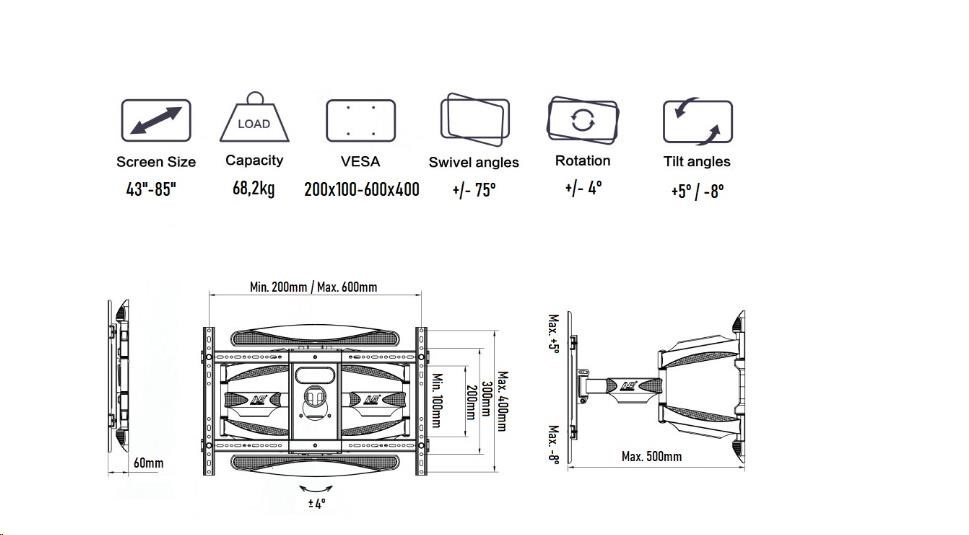 Držiak na TV NB P65 Profesionálny držiak na zavešenie TV 43" - 85" na stenu, umožňuje otáčanie do strán až +75° / -75°, naklápanie +5° / -8°, nastavenie vzdialenosti od steny 60 - 500 mm, podporuje VESA štandardy 200x100 až 600x400, korekcia roviny +4° / -4°, systém pre skryté vedenie káblov, nosnosť 68,2 kg Potrebujete zaviesť LCD alebo LED televízor na stenu a otáčať s ním do strán, prípadne nakloniť nahor alebo nadol? Vyžadujete len najvyššiu kvalitu, bezpečnosť a krásny dizajn? V tom prípade Vám odporúčame držiak NB P65: Profesionálny špičkový držiak na televízie NB P65 NB P65 je vhodný na zavešenie všetkých typov televízorov s hmotnosťou do 68 kg a podporou VESA štandardu 200x100 až 600x400, všeobecne na televízory s uhlopriečkou 43" - 85". Po zavešení jednoducho nastavíte televízor do požadovanej polohy - otáčanie do strán, náklon, vzdialenosť od steny, korekcia roviny. Držiak podporuje skryté vedenie káblov. Dodáva sa vrátane všetkého montážneho materiálu a malej vodováhy. Konštrukcia držiaku TV NB P65 je na vynikajúcej úrovni ako kvalitou, tak spracovaním. Vhodný je aj pre každodennú manipuláciu s obrazovkou. Televízny držiak otočný do strán a sklopný NB P65 Technické údaje: maximálne zaťaženie 68,2 kg podporuje VESA štandardy 200x100 až 600x400 odporúčame na TV s uhlopriečkami 43" až 85" otáčanie do strán až +75° / -75° náklon +5° / -8° korekcia roviny +4° / -4° minimálna vzdialenosť TV od steny 60 mm maximálna vzdialenosť TV od steny 500 mm systém pre skryté vedenie káblov kvalitná oceľová konštrukcia montážny materiál súčasťou balenia zaistenie TV proti vysadeniu záruka 5 rokov