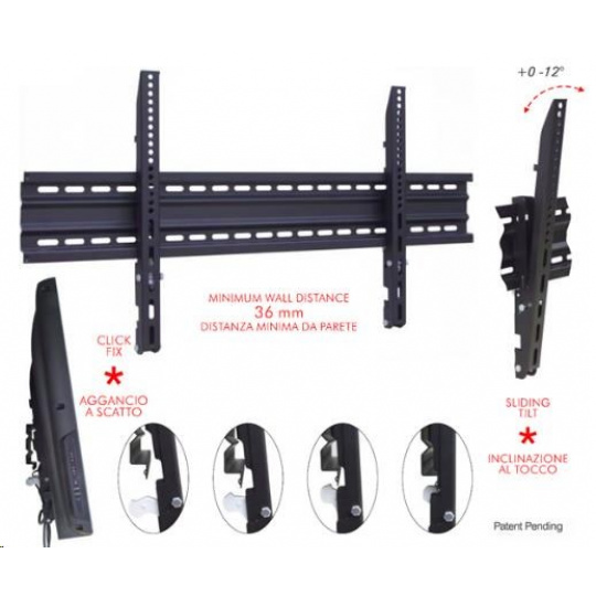 Technické údaje: nosnosť 60kg na TV 37" - 65" vzdialenosť od steny len 36mm náklon 0 / -12 st. VESA 100x100 - 800x400mm patentovaný systém náklonu a zámku TV moderný dizajn dodávané vrátane montážneho materiálu odolná čierna farba záruka 5 rokov