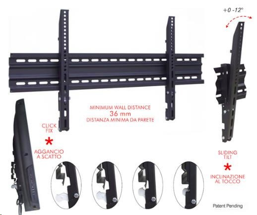 Technické údaje: nosnosť 60kg na TV 37" - 65" vzdialenosť od steny len 36mm náklon 0 / -12 st. VESA 100x100 - 800x400mm patentovaný systém náklonu a zámku TV moderný dizajn dodávané vrátane montážneho materiálu odolná čierna farba záruka 5 rokov