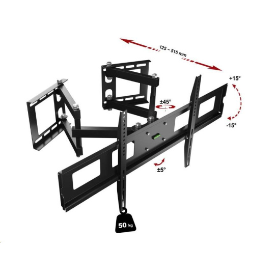 Držiak na TV do rohu Fiber Novelty FN13 Špeciálny držiak na zavesenie TV do rohov ale aj na rovné steny, na TV 43-80", otočný +/- 60°, sklopný +/- 15°, vzdialenosť od steny 125-515mm, korekcia roviny +/- 5°, inštalačný materiál, VESA štandardy 75x75 až 800x400, nosnosť 50kg Robustný televízny držiak umožňujúci pripevnenie televízora LCD LED a PLAZMA do rohov miestností ale aj na rovné steny. Pri inštalácii do rohov vďaka uchyteniu na oboch stenách ľahko nastavíte televízor do ideálnej polohy. Odporúčaná veľkosť televízorov je 43" až 80". Televízor je možné sklopiť až o 15°. Podpora VESA 75x75 až 800x400, nosnosť 50kg. Pri inštalácii na rovnom stenách je nastaviteľná vzdialenosť 125-515mm a otáčanie do strán +/- 45°, pri inštalácii do rohov sa vzdialenosť a otáčanie mení v závislosti od miery rozopnutia nástenných ramien. Súčasťou televízneho držiaku je aj integrovaná vodováha na presnú montáž a všetok inštalačný materiál. Záruka 5 rokov. Televízny držiak na uchytenie do rohu miestnosti Fiber Novelty FN13 Technické údaje: nosnosť 50kg podpora VESA štandardu 75x75 až 800x400 ideálny na televízory s uhlopriečkou 43" až 80" otáčanie do strán +/- 45° možnosť náklonu +/- 15° vzdialenosť od steny 125 - 515mm korekcia roviny +/- 5° integrovaná vodováha poctivá oceľová konštrukcia inštalácia do rohov miestností aj na rovné steny ľahké nastavenie televízora do požadovanej polohy záruka 5 rokov
