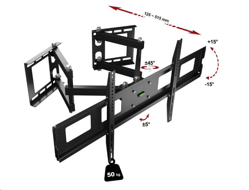Držiak na TV do rohu Fiber Novelty FN13 Špeciálny držiak na zavesenie TV do rohov ale aj na rovné steny, na TV 43-80", otočný +/- 60°, sklopný +/- 15°, vzdialenosť od steny 125-515mm, korekcia roviny +/- 5°, inštalačný materiál, VESA štandardy 75x75 až 800x400, nosnosť 50kg Robustný televízny držiak umožňujúci pripevnenie televízora LCD LED a PLAZMA do rohov miestností ale aj na rovné steny. Pri inštalácii do rohov vďaka uchyteniu na oboch stenách ľahko nastavíte televízor do ideálnej polohy. Odporúčaná veľkosť televízorov je 43" až 80". Televízor je možné sklopiť až o 15°. Podpora VESA 75x75 až 800x400, nosnosť 50kg. Pri inštalácii na rovnom stenách je nastaviteľná vzdialenosť 125-515mm a otáčanie do strán +/- 45°, pri inštalácii do rohov sa vzdialenosť a otáčanie mení v závislosti od miery rozopnutia nástenných ramien. Súčasťou televízneho držiaku je aj integrovaná vodováha na presnú montáž a všetok inštalačný materiál. Záruka 5 rokov. Televízny držiak na uchytenie do rohu miestnosti Fiber Novelty FN13 Technické údaje: nosnosť 50kg podpora VESA štandardu 75x75 až 800x400 ideálny na televízory s uhlopriečkou 43" až 80" otáčanie do strán +/- 45° možnosť náklonu +/- 15° vzdialenosť od steny 125 - 515mm korekcia roviny +/- 5° integrovaná vodováha poctivá oceľová konštrukcia inštalácia do rohov miestností aj na rovné steny ľahké nastavenie televízora do požadovanej polohy záruka 5 rokov