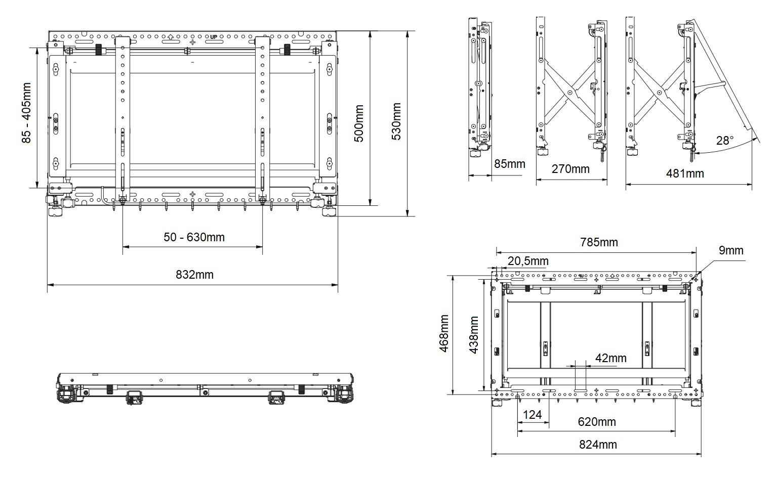 Technické údaje: maximálne zaťaženie 60kg na televízory a monitory s uhlopriečkou 40" až 65" VESA štandard 100x100 až 600x400 nezávislé zavesenie každej obrazovky 8-polohové nastavenie každej z obrazoviek bez použitia náradia zásuvný mechanizmus pre pohodlný prístup k obrazovkám možnosť uzamknutia zatahovacieho mechanizmu otvorená konštrukcia držiaka umožní jednoduchý prístup k zapojeniu obrazoviek profesionálna konštrukcia držiaka eliminuje nutnosť výpočtov pre realizáciu montáže pružinový systém na nastavenie požadovanej tuhosti - v prípade zavesenia obrazoviek rôznych hmotností najvyššia kvalita, špičkový nezávislý systém zavesenia farba čierna záruka 5 rokov Držiak pre sestavu videosteny EDBAK VWPOP85-L podporuje VESA štandardy: VESA 100x100 VESA 200x100 a 100x200 VESA 200x200 VESA 300x200 a 200x300 VESA 300x300 VESA 400x200 a 200x400 VESA 400x300 a 300x400 VESA 400x400 VESA 600x400
