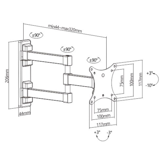 Držiak na TV a monitory Fiber Mounts FM234 Kvalitný nástenný držiak na zavesteie televízorov a monitorov 13-32", nastavenie vzdialenosti od steny 44-320mm, otočný +/- 90°, sklápateľný +3° / -10°, korekcia roviny +/- 3°, nástenná krytka, ľahké zavesteie TV, VESA štandardy 75x75 a 100x100, nosnosť 20kg Kvalitný a pekný polohovateľný držiak na televízie a monitory s uhlopriečkou 13-32" (podľa hmotnosti a VESA aj väčší). Držiak má veľmi jednoduchú inštaláciu televízie vďaka demontovateľnej VESA doske - tá sa samostatne namontuje na televíziu a následne celú TV cez VESA dosku upevníte do držiaku a zaistíte skrutkou. Veľkým pomocníkom je aj korekcia roviny obrazovky +/- 3°. Televízory alebo monitory môžete po uchytení na držiak otáčať do strán až o +/- 90° (podľa šírky TV), naklápať od +3° až do -10°. Držiak podporuje VESA štandardy 75x75 a 100x100 a má nosnosť 20kg. V balení nájdete krytku nástenného úchytu a inštalačný materiál. Farebné prevedenie je čierne. Predĺžená záruka na 5 rokov. Kvalitný nástenný držiak na televízie a monitory Fiber Mounts FM234 Technické údaje: nosnosť 20kg podporuje VESA štandardy 75x75 a 100x100 ideálny na televízory a monitory s uhlopriečkou 13" až 32" nastaviteľná vzdialenosť TV od steny 44-320mm otočenie na obe strany až +/- 90° (v závislosti od šírky TV) naklápanie hore až +3° a dole až -10° korekcia roviny obrazovky +/- 3° krytka nástenného úchytu na zakrytie kotviacich skrutiek kvalitná oceľová konštrukcia ľahké uchytenie televízie alebo monitora na držiak farebné prevedenie čierne balenie obsahuje inštalačný materiál predĺžená záruka na 5 rokov Veľmi jednoduchá inštalácia televízie na držiak vďaka možnosti odobratia VESA dosky Fiber Mounts FM234 Nástenný držiak TV monitora Fiber Mounts FM234 podporuje VESA štandardy: VESA 75x75 VESA 100x100 Na držiaky Fiber Mounts FM234 je možné zaveste všetky televízory, monitory a displeje, ktorých hmotnosť nie je vyššia ako 20kg a ktoré podporujú ktorýkoľvek z vyššie uvedených VESA štandardov. Uvádzaná veľkosť / uhlopriečka televízora nie je podstatná a neurčuje, či je TV na držiak vhodná.