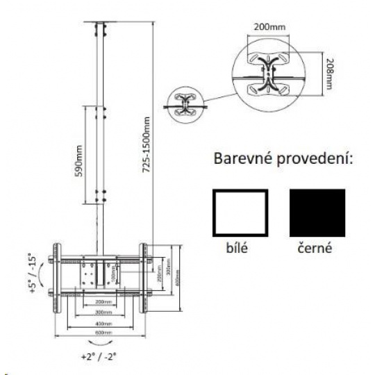 Technické údaje: maximálna záťaž 68kg podpora VESA štandardov 100x100 až 600x400 odporúčaná uhlopriečka obrazovky 32 až 60 palcov nastaviteľná dĺžka 725-1500mm možnosť náklonu obrazovky +5° až -15° doprava TV po montáži +/- 2° uchytenie na strop alebo na stenu - držiak je možné otočiť o 90° otočný o +/- 30° výnimočná kvalita moderný dizajn farebné prevedenie čierna záruka 5 rokov Držiak podporuje VESA štandardy: VESA 100x100 VESA 200x100 VESA 200x200 VESA 300x200 VESA 300x300 VESA 400x200 VESA 400x300 VESA 400x400 VESA 600x400