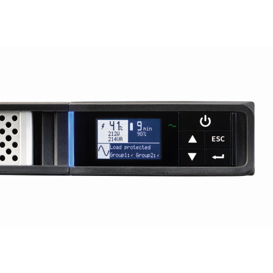 - Nový grafický LCD displej poskytuje na jednej obrazovke základné informácie o stave UPS a o meraných veličinách (v siedmich jazykoch podľa voľby). K dispozícii sú tiež rozšírené možnosti konfigurácie pomocou zrozumiteľných navigačných tlačidiel.