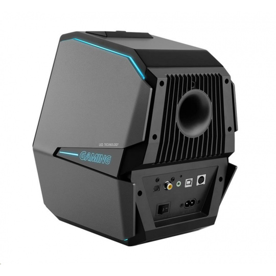 Spojením drevenej skrinky reproduktorov s hliníkovými bočnými panelmi umožnili dizajnéri zakomponovať špičkové osvetlenie RGB, čím vytvorili jedinečný vzhľad.