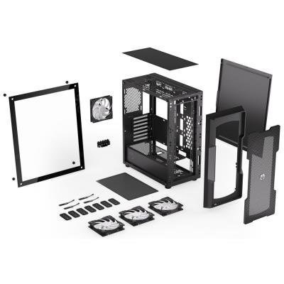 Skriňa formátu Middle Tower s priehľadnou bočnicou z tvrdeného skla ponúka dve 2,5" pozície pre SSD disky a dve 3,5" pozície pre pevné disky. Na hornej časti sa nachádza dva USB 3.0 porty, slúchadlový výstup a audio vstup pre mikrofon. Vybavená je štyrmi 120 mm ventilátormi s ARGB podsvietením, ktoré spolu s perforovaným čelným panelom zabezpečujú dostatočné prúdenie vzduchu. Dômyselné riešenie umožňuje pohodlné umiestnenie až 360 mm dlhého výmenníka vodného chladenia na prednej strane. Vo skrini je dostatok priestoru pre chladič CPU do výšky až 162 mm a grafickú kartu o dĺžke až 370 mm. Dodávaná je bez zdroja. Súčasťou je tiež interný ARGB ovládač a sada prachových filtrov.