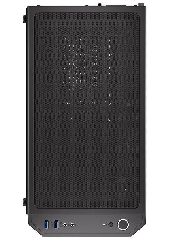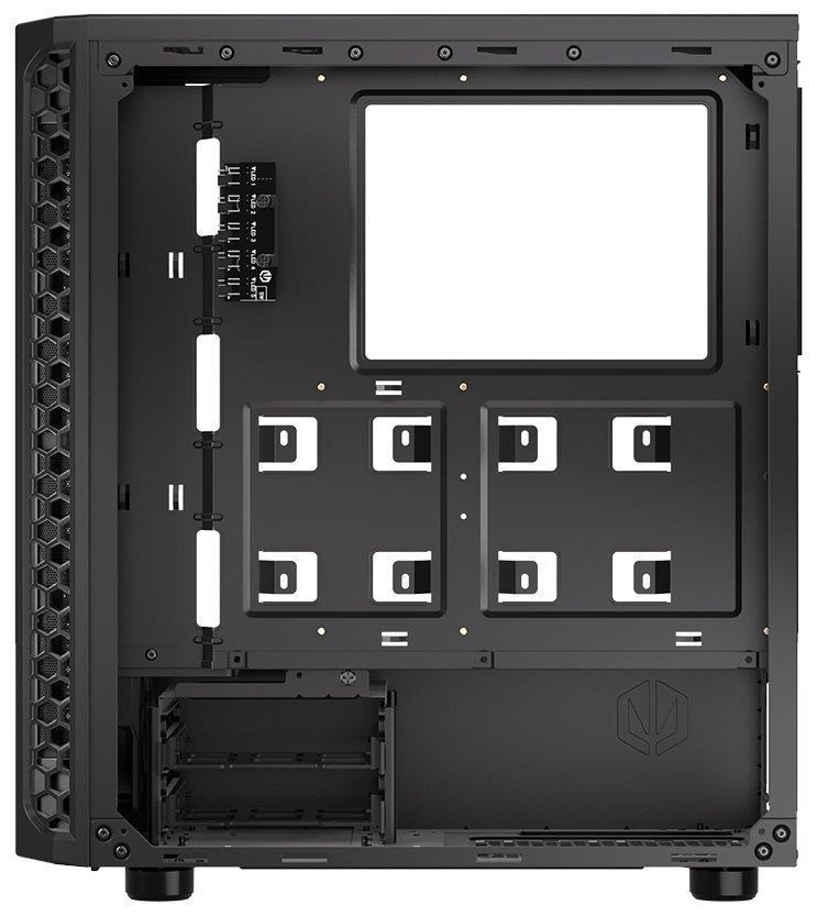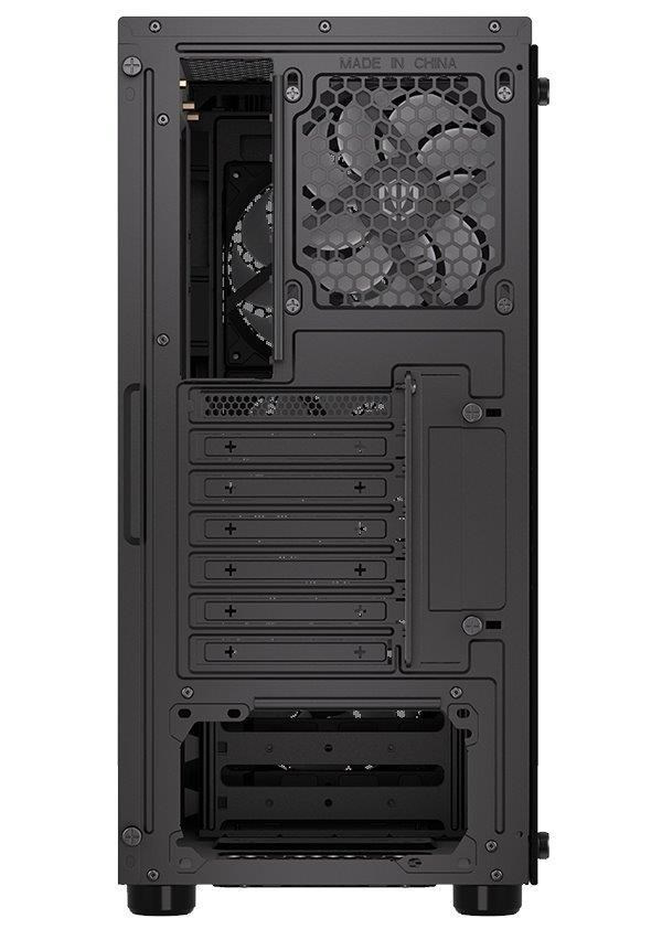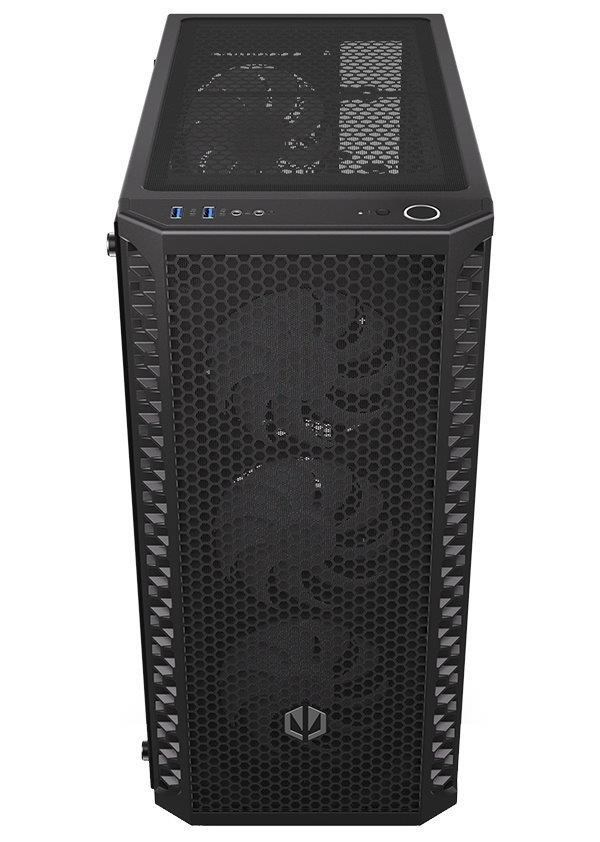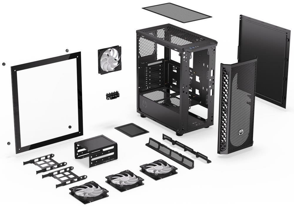 Skriňa formátu Middle Tower s priehľadnou bočnicou z tvrdeného skla ponúka dve 2,5" pozície pre SSD disky a dve 3,5" pozície pre pevné disky. Na hornom paneli sa nachádzajú dva USB 3.0 porty, slúchadlový výstup a audio vstup pre mikrofón. Je vybavená štyrmi 120 mm ventilátormi s ARGB podsvietením, ktoré spolu s perforovaným čelným panelom zabezpečujú dostatočné prúdenie vzduchu. Nápadité riešenie umožňuje pohodlné umiestnenie až 360 mm dlhého výmeníka vodného chladenia na prednej strane. Vo skrini je dostatok priestoru pre chladič CPU do výšky až 161 mm a grafickú kartu dlhú až 350 mm. Dodáva sa bez zdroja. Súčasťou je tiež sada prachových filtrov.