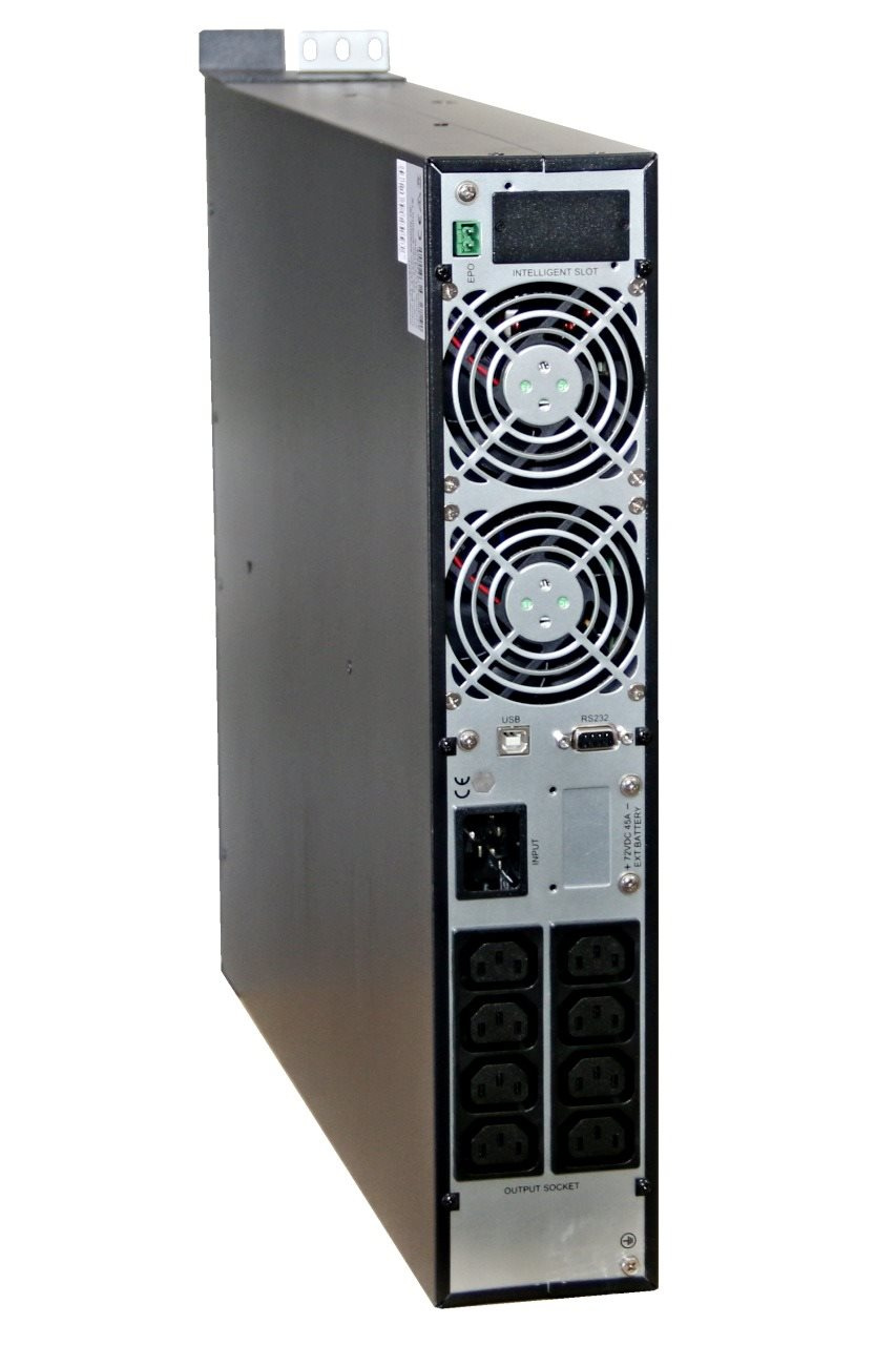 Online záložný zdroj EA903PRT so sínusovým výstupom. Rozmerovo navrhnutý pre serverové aplikácie (montáž do 19" racku). Súčasťou balenia sú plastové podstavce na vertikálne umiestnenie. 3 ovládacie tlačidlá a informačný displej na prednom paneli.