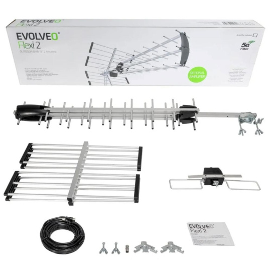 LTE/4G/5G filter. Rozšíriteľná o zosilňovač EVOLVEO AMP 1 s 5G filtrom. Zosilňovač spĺňa normu Radio Equipment Directive 2014/53EU (RED) a je teda bezpečný pre zdravie človeka. Súčasťou balenia je kábel 10 m, redukcia a úchyt pre upevnenie antény.