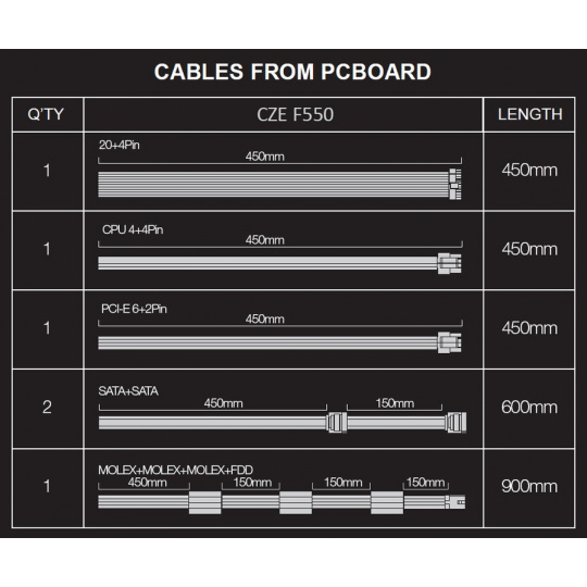 - 1x MOLEX, 450mm + MOLEX 150mm + MOLEX 150mm + FDD 150 mm