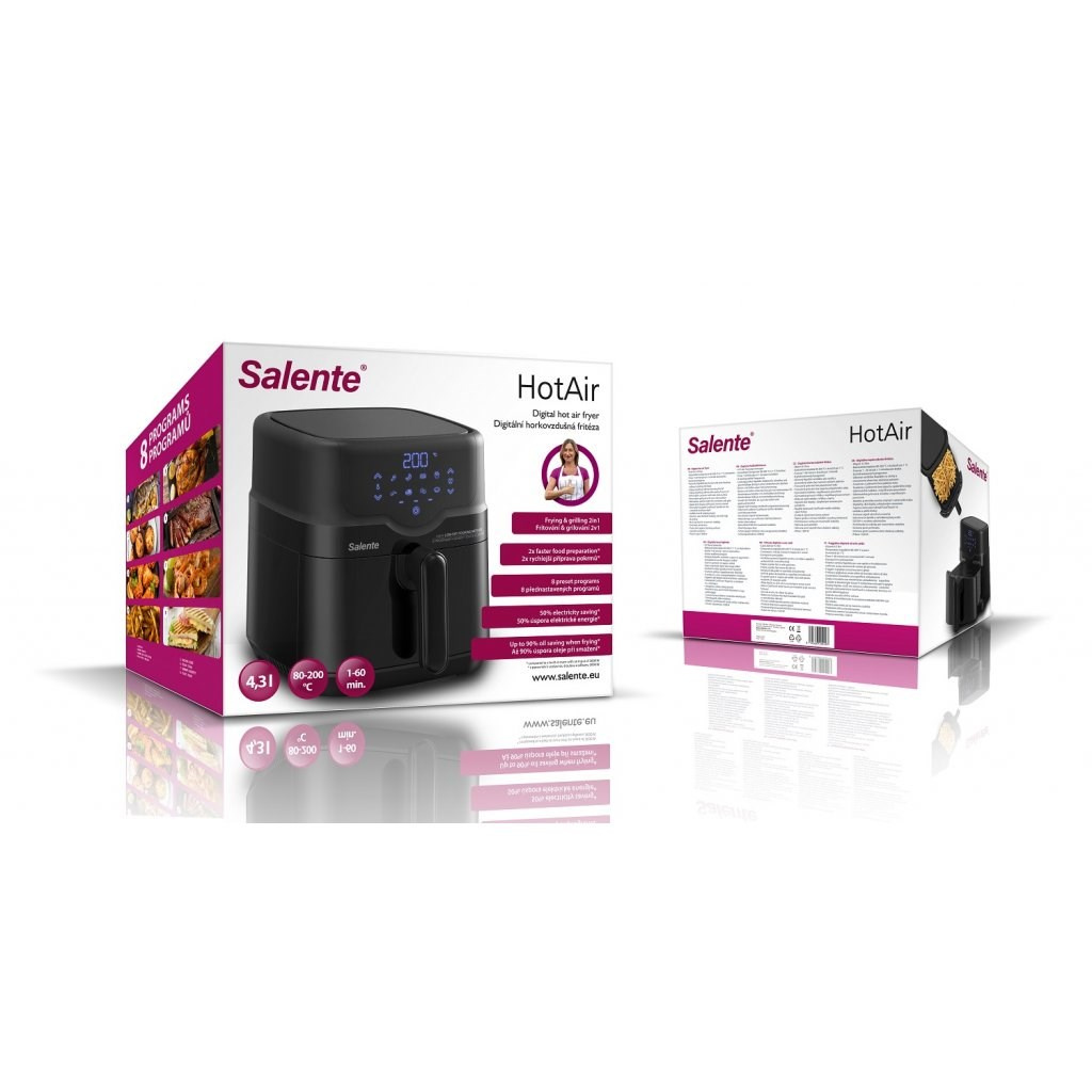 Horkovzdušná fritéra Salente HotAir spĺňa súčasné najvyššie nároky na zdravú a rýchlu prípravu jedál a ponúka kombináciu dvoch spôsobov prípravy - fritovanie aj grilovanie. Aj tým najnáročnejším kuchárom a kuchárkam umožňuje nastavenie teploty v rozsahu 80-200 °C v krokoch po 1 °C a nastavenie času prípravy jedla v rozsahu 1-60 minút v krokoch po 1 minúte.