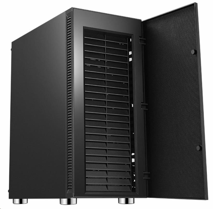 Odhlučnená ATX midi veža. Skrinka je určená pre základné dosky podporujúce platformu Intel aj AMD. Okrem formátu ATX je kompatibilná aj s formátom Micro ATX a Mini ITX. Zdroj napájania sa umiestňuje do dolnej časti skrinky. Spodná mriežka je osadená vysúvacím prachovým filtrom. Súčasťou sú dve tiché ventilátory pre lepší airflow.