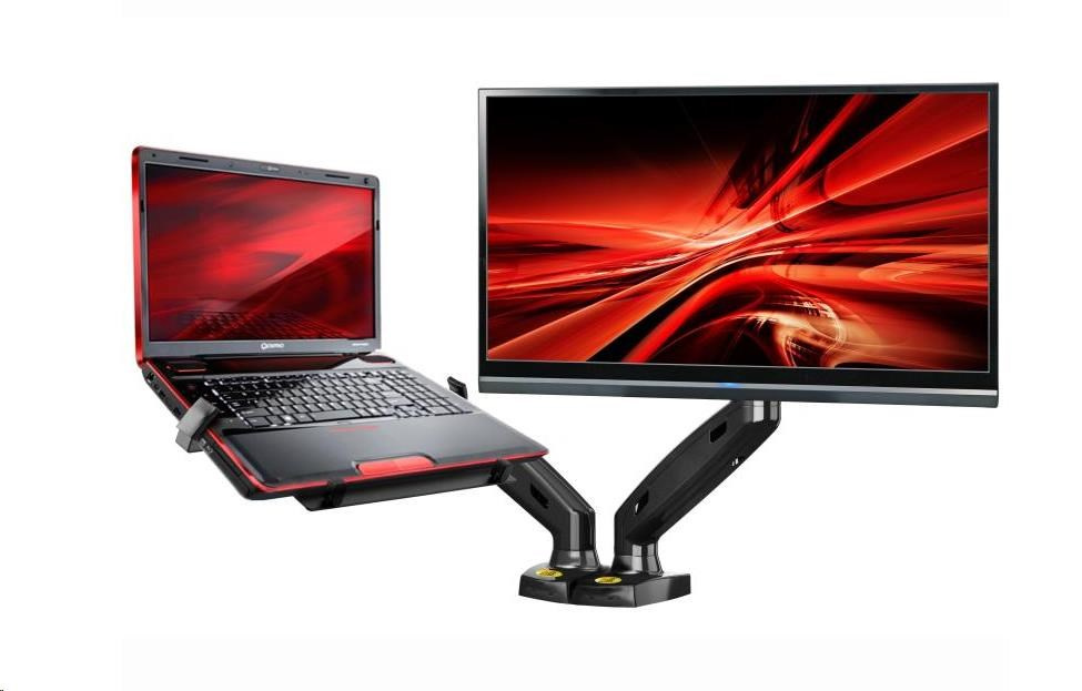 Fiber Mounts H3F160 Držiak na notebook a monitor Súprava držiaka na monitory NB F160 + držiaku na notebook Ergosolid NBH3 za zvýhodnenú cenu, umožňuje umiestniť na držiak monitor 17" - 27" a notebook 10,1" - 17", otáčanie do strán, naklonenie, dĺžkové a výškové polohovanie, nosnosť 2x 9 kg Špičkový stolový držiak do kancelárie, firmy alebo domácnosti na zavesenie monitora a notebooku. Držiak umožňuje kompletnú polohovateľnosť ako monitoru, tak aj notebooku - otáčanie do strán, naklonenie, dĺžkové a výškové nastavenie, korekciu roviny. Ramenné súpravy majú systém na vedenie káblov. Upevnenie je možné na všetky typy stolov alebo dosiek s hrúbkou 10 mm až 100 mm, existujú dva spôsoby upevnenia - na kraj stolovej dosky alebo kamkoľvek do priestoru (ukotvenie skrz stolovú dosku - nutný otvor). Stolový držiak na upevnenie notebooku (laptopu) a monitora Fiber Mounts H3F160 je vynikajúcej kvality, veľmi pekného dizajnu a poskytujeme naň záruku 5 rokov. Stolový držiak na monitor a notebook do kancelárie, pracovne, firmy alebo domácnosti Fiber Mounts H3F160 Technické údaje: možné zaťaženie každého ramena 2kg až 9kg celková nosnosť držiaka 18kg podporuje VESA štandardy 75x75 a 100x100 odporúčaná uhlopriečka monitora 17" až 27" na notebooky a laptopy 10,1" až 17" výškové polohovanie 250mm otočný +180° / -180° naklonenie +35° / -50° funkcia pivot - otáčanie monitora do horizontálnej alebo vertikálnej polohy korekcia roviny monitora aj notebooku vhodný na upevnenie všetkých notebookov a laptopov s šírkou 255-380 mm systém na vedenie káblov výborná kvalita krásny dizajn záruka 5 rokov