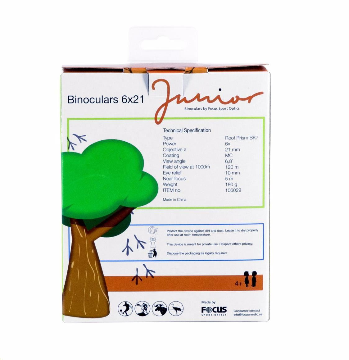 < p >Focus Junior 6x21 je perfektný binokulárny ďalekohľad, ktorý nesmie chýbať vo výbave žiadneho malého pozorovateľa.< /p > < p >Výber zo dvoch farebných prevedení ocení nielen chlapci, ale aj odvážne dievčatá. Tento malý kapesný ďalekohľad je určený pre deti s rozsahom očí medzi 50 - 63 mm. Špeciálna konštrukcia s jedným centrálnym kĺbom zabezpečí ideálnu stabilitu.< /p > < p >Veľké zaostrovacie koliesko uľahčuje úpravu ostrosti a povrchová úprava optiky poskytuje jasný obraz.< /p > < p >Kaučukové telo je odolné voči nárazom a zároveň zabezpečuje bezpečné a príjemné uchopenie. Vďaka tomu sa vyhnete nechceným pádom z dôvodu nepríjemného držania, čo ocení každý rodič.< /p > < p >Vďaka 6-násobnému zväčšeniu umožníte svojím deťom rýchlejšie a jednoduchšie zazrieť vtáky alebo iné zvieratá, ktoré deti jednoducho milujú.< /p > < p >Balenie tiež obsahuje puzdro na opasok, nákrčník a čistiacu handričku na optiku.< /p > < p >Švédska značka Focus Sport Optics vyrába optiku od roku 1985. Jej produkty sú v severských krajinách, kde je príroda nekompromisná, obľúbené vďaka skvelému pomeru ceny a výkonu.< /p >