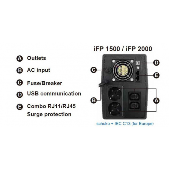 - Typ výstupnej zásuvky: 2 x zásuvka Schuko + IEC C13