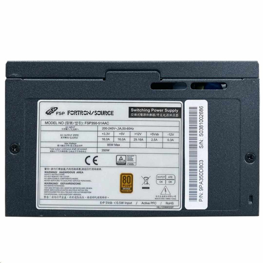 Napájací zdroj Fortron FSP350-51AAC 85+ ATX s výkonom 350 W. Pre dlhodobú spoľahlivú prevádzku je Fortron FSP350-51AAC 85+ vybavený 120 mm ventilátorom. Napájanie je možné zastaviť pomocou zabudovaného vypínača.