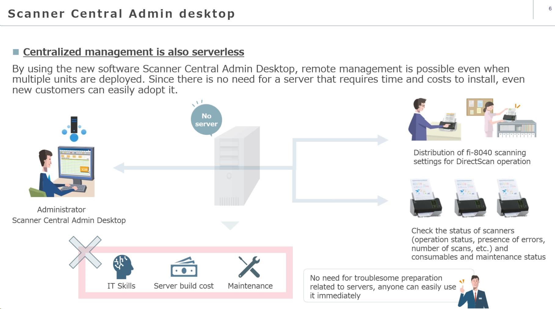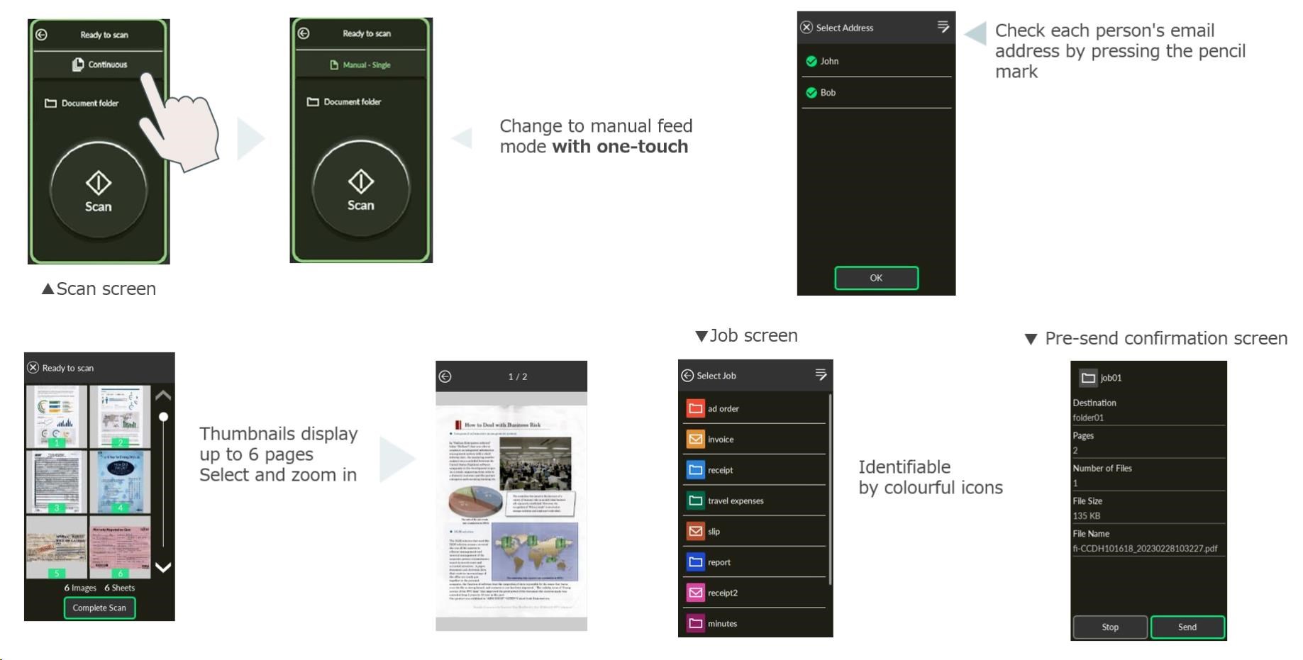| Formáty výstupných súborov | PDF, Vyhľadateľný PDF, PDF/A, TIFF, Viacstránkový TIFF, Bitmap, JPEG, JPEG2000, PNG, Word, Excel, PowerPoint Pri použití DirectScan: len JPEG, PDF, Jednostránkový PDF | |