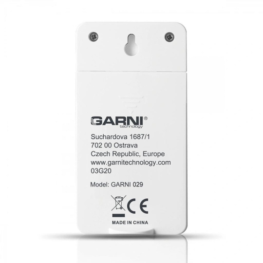Bezdrôtové čidlo na meranie teploty, určené pre meteorologickú stanicu GARNI 365 Arcus vlhkosti odolné, krytie IPX4 (odolné voči striekajúcej vode) displej o rozmeroch 19 x 11 mm veľkosť číslic na displeji: teplota 6,5 mm meranie teploty 3 kanály maximálny RF výkon 10 dBm (10 mW) možnosť postavenia a zavešenia farba biela