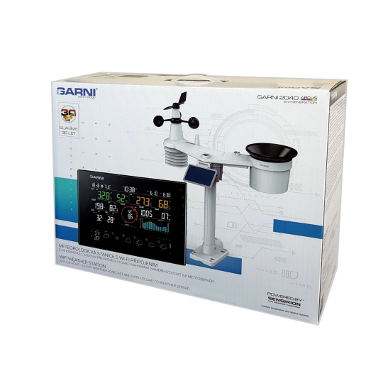 Integrované bezdrôtové čidlo 7-v-1 GARNI 1NG meria vonkajšiu teplotu a relatívnu vlhkosť, rýchlosť a smer vetra, dažďové zrážky, UV index a slnečné žiarenie, a dáta sú odosielané do hlavnej jednotky až do vzdialenosti 150 m (v otvorenom priestore). Napájanie zabezpečuje vstavaný kapacitor, ktorý je nabíjaný pomocou vstavaného solárneho panelu. Batéria slúži ako záložný zdroj. Čidlá sú úplne smontované a kalibrované, aby bola inštalácia čo najjednoduchšia. Hlavná jednotka je vybavená ľahko čitateľným displejom VA s ultračiernym pozadím a automatickou reguláciou jasu, ktorý okrem dát zo všetkých pripojených čidiel (napr. čidla na meranie teploty a relatívnej vlhkosti, bazénové čidlo, čidlo vlhkosti a teploty pôdy, čidlo detekcie búrok, čidlo kvality ovzdušia) zobrazuje predpoveď počasia, barometrický tlak, indikátory počasia spolu s pokročilými funkciami a informáciami, ako je výstražný alarm pre vysoké/nízke namerané hodnoty a stratu spojenia s čidlami prostredníctvom notifikácií v mobilnej aplikácii, a iné. Vysokorýchlostný procesor hlavnej jednotky analyzuje namerané hodnoty meteorologických veličín, vstavaná pamäť uchováva maximálne / minimálne namerané hodnoty za daný deň alebo od začiatku merania, a automaticky nastavuje čas a dátum z internetu. Jednoduché ovládanie, ľahká údržba, možnosť kalibrácie, zobrazenie času východu a západu Slnka a Mesiaca, zobrazenie fázy Mesiaca, automatická regulácia jasu displeja, množstvo meraných veličín a dlhodobá predpoveď robí z nej výnimočnú profesionálnu meteorologickú stanicu pre váš domov.