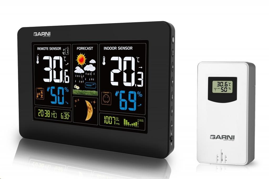 Meteorologická stanica so špičkovým inverzným farebným VA displejom s časovo riadeným rádiovým signálom DCF-77, budíkom, meraním vnútornej teploty, relatívnej vlhkosti a absolútneho barometrického tlaku, bezdrôtovým čidlom na meranie vonkajšej teploty a relatívnej vlhkosti a USB portom na nabíjanie externých zariadení inverzný farebný VA displej o rozmeroch 167 x 93 mm s možnosťou trvalého osvetlenia pri napájaní sieťovým adaptérom alebo krátkodobým osvetlením na 15 s pri napájaní batériami 4 stupne jasu osvetlenia displeja, možnosť vypnutia osvetlenia displeja s možnosťou krátkodobého osvetlenia na 15 s (pri napájaní sieťovým adaptérom) veľkosť číslic na displeji – čas, dátum, barometrický tlak 8 mm, skratka názvu dňa 6 mm, vnútorná a vonkajšia teplota 30 mm, vnútorná a vonkajšia relatívna vlhkosť 20 mm čas a dátum riadené signálom DCF-77 s možnosťou manuálneho nastavenia ikona príjmu signálu DCF-77 skratka názvu dňa 12-hodinový alebo 24-hodinový formát zobrazenia času možnosť nastavenia časového pásma od -12 do +12 hodín budík s funkciou opakovaného budenia (Snooze) po 5 minútach budící signál - 10 sekúnd 1 pípnutie za sekundu, 10 sekúnd 2 pípnutia za sekundu, 10 sekúnd 4 pípnutia za sekundu a potom stále 8 pípnutí za sekundu 6 animovaných ikon predpovede počasia (slnečno, polooblačno, oblačno, zrážky, silný dážď a sneženie) na základe sledovania barometrického tlaku vestaveným barometrom zobrazenie hodnôt vnútorná a vonkajšia teplota a relatívna vlhkosť pamäť na maximálne a minimálne namerané hodnoty teploty a rel. vlhkosti s automatickým vymazaním o 0:00 meranie absolútneho barometrického tlaku (mb / hPa alebo inHg) šipky tendencie vývoja absolútneho barometrického tlaku, vnútorná a vonkajšia teplota a relatívna vlhkosť možnosť nastavenia alarmu horného a dolného okraja vonkajšej teploty v rozsahu od -20°C do +60°C (akustický signál a ikona na displeji) pre každý kanál zvlášť s indikáciou námrazy v rozsahu od -1°C do +3°C zobrazenie teploty vo °C alebo °F možnosť použitia až 3 bezdrôtových čidl GARNI 30H (jedno čidlo GARNI 030H je súčasťou balenia) funkcia automatického prepínania kanálov 5 ikôn vnútorného tepelnú pohodu bezdrôtový prenos hodnôt vonkajšej teploty a relatívnej vlhkosti na frekvencii 433 MHz ikona príjmu signálu bezdrôtového čidla zobrazenie fázy Mesiaca USB port na nabíjanie mobilných zariadení (len pri napájaní hlavnej jednotky sieťovým adaptérom), maximálny nabíjací prúd 1000 mA ikony slabých batérií napájanie sieťovým adaptérom alebo batériami možnosť postavenia alebo zavešenia farba čierna Bezdrôtové čidlo GARNI 030H odolné voči vlhkosti displej o rozmeroch 19 x 11 mm veľkosť číslic na displeji: teplota a relatívna vlhkosť 4 mm meranie teploty a relatívnej vlhkosti 3 kanály maximálny RF výkon 10 dBm (10 mW) možnosť postavenia a zavešenia farba biela Obsah balenia: 1 x hlavná jednotka GARNI 545 Line 1 x bezdrôtové čidlo GARNI 030H 1 x sieťový adaptér český, slovenský, nemecký, anglický, taliansky, poľský a maďarský návod