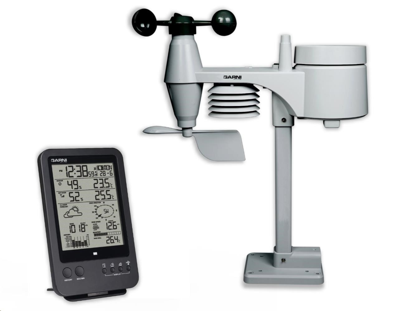 Meteostanica s meraním vnútornej a vonkajšej teploty, relatívnej vlhkosti, barometrického tlaku, rýchlosti a smeru vetra, zrážok a predpovede počasia