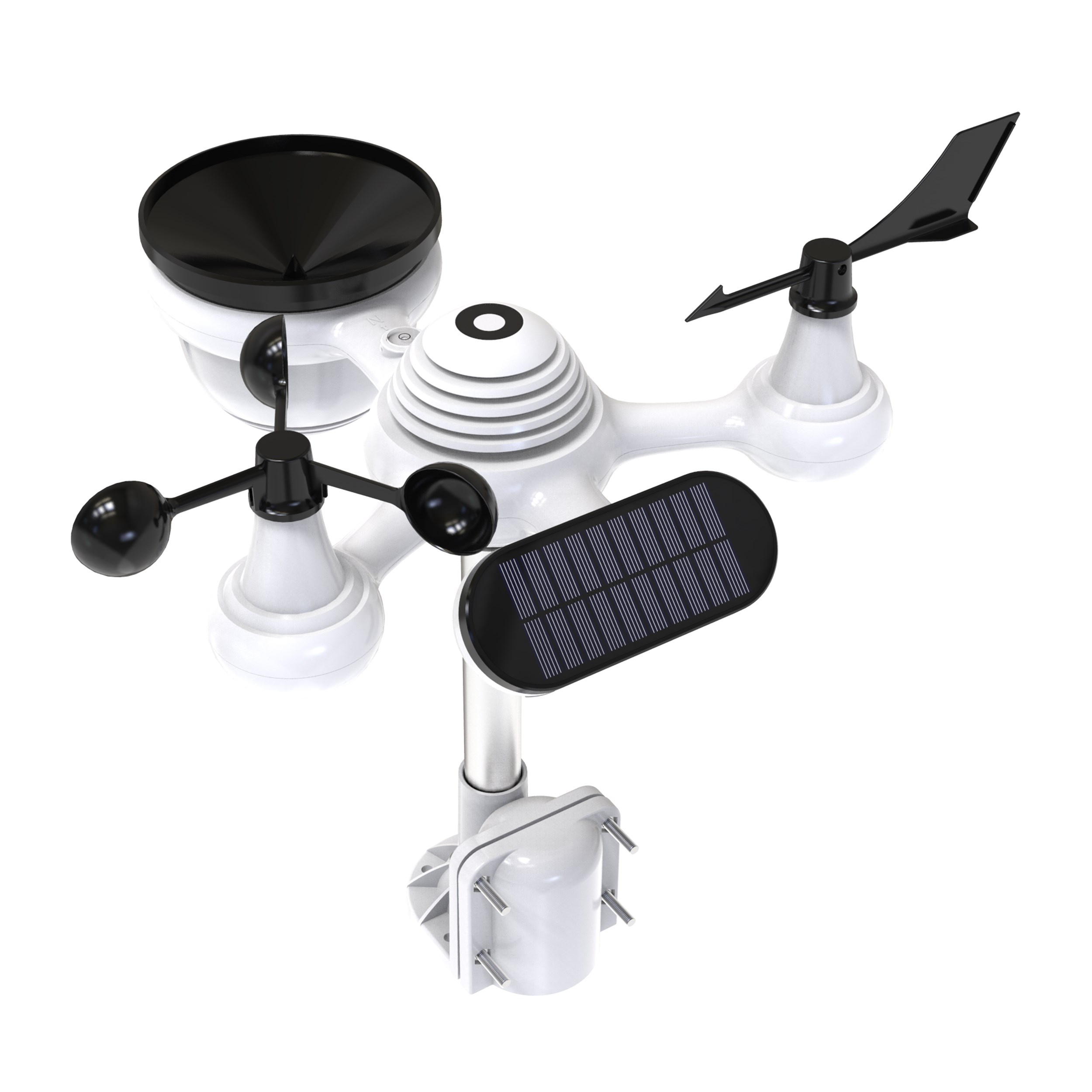 - farba biela, uchyt montážneho tyče, solárny panel, nálevka srážkomera, korouhvička a veterník čierna