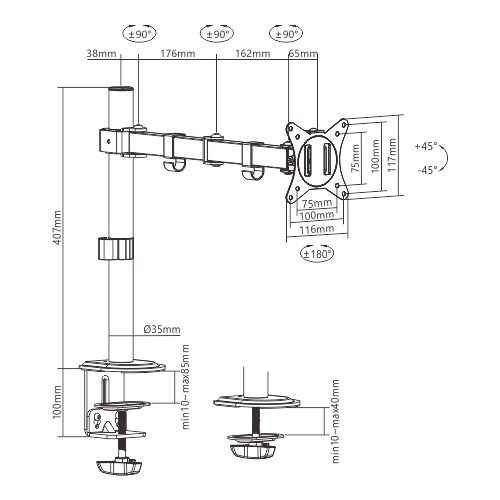 - Rameno umožňuje otáčať, vysúvať, zatahovat alebo nakláňať váš displej a umožňuje otočenie displeja z režimu na šírku do režimu na výšku atď.